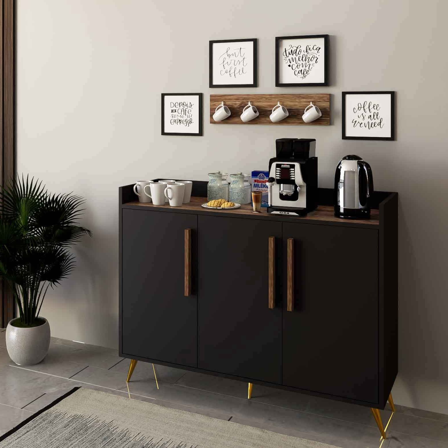- ركن وطاولة قهوة مزود برفوف داخلية ورفوف جدارية لوضع وتعليق الأكواب.