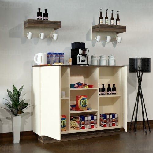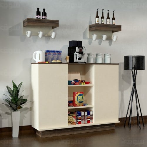 - ركن وطاولة قهوة مزود برفوف داخلية ورفوف جدارية لوضع وتعليق الأكواب.