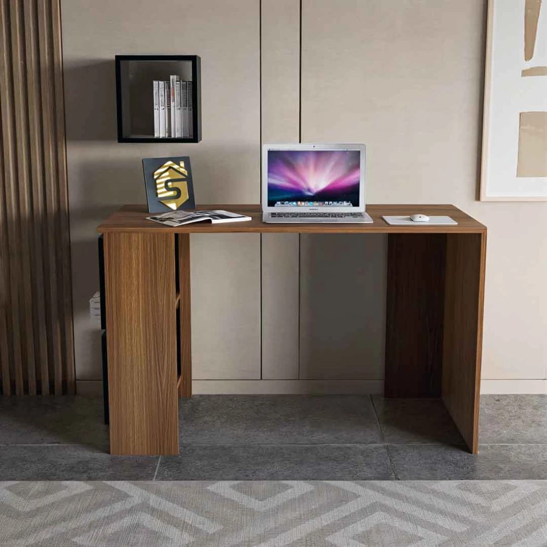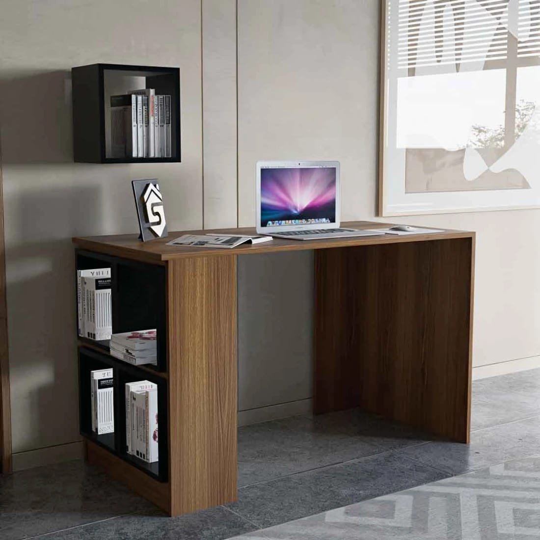 - التصميم الأنيق: طاولة مكتب بتصميم أنيق جدًا، بها عدد من الأرفف جهة اليسار ، والتي تساعد على تخزين الكتب أو قطع الديكور، إذا لم تكن تدرس يمكنك وضع الصور التذكارية وأغراض العمل.